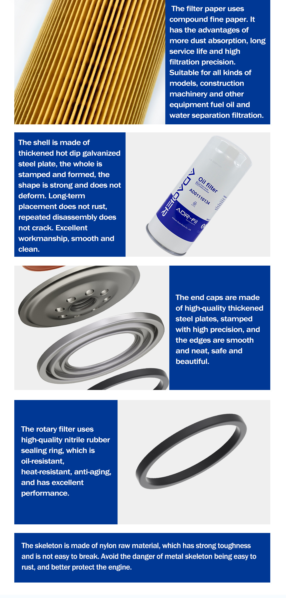 Anillo de sello de goma: anillo de sellado de caucho nitrílico de alta calidad, resistente al aceite y al calor (temperatura de trabajo -45° a 130°), que debe cambiarse según el ciclo prescrito; de lo contrario, los sistemas de inyección pueden obstruirse y la seguridad operativa verse comprometida. Los filtros ADAOER mantienen su efecto de filtración de primera clase durante intervalos especialmente prolongados.